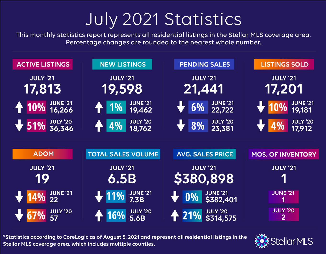 Stellar MLS publishes county-level real estate statistics and key stats from Matrix for our coverage area mid-to-late month, every month, for the previous month’s activity. Following are the latest stats available to quickly get you up to speed on real estate trends in our area.