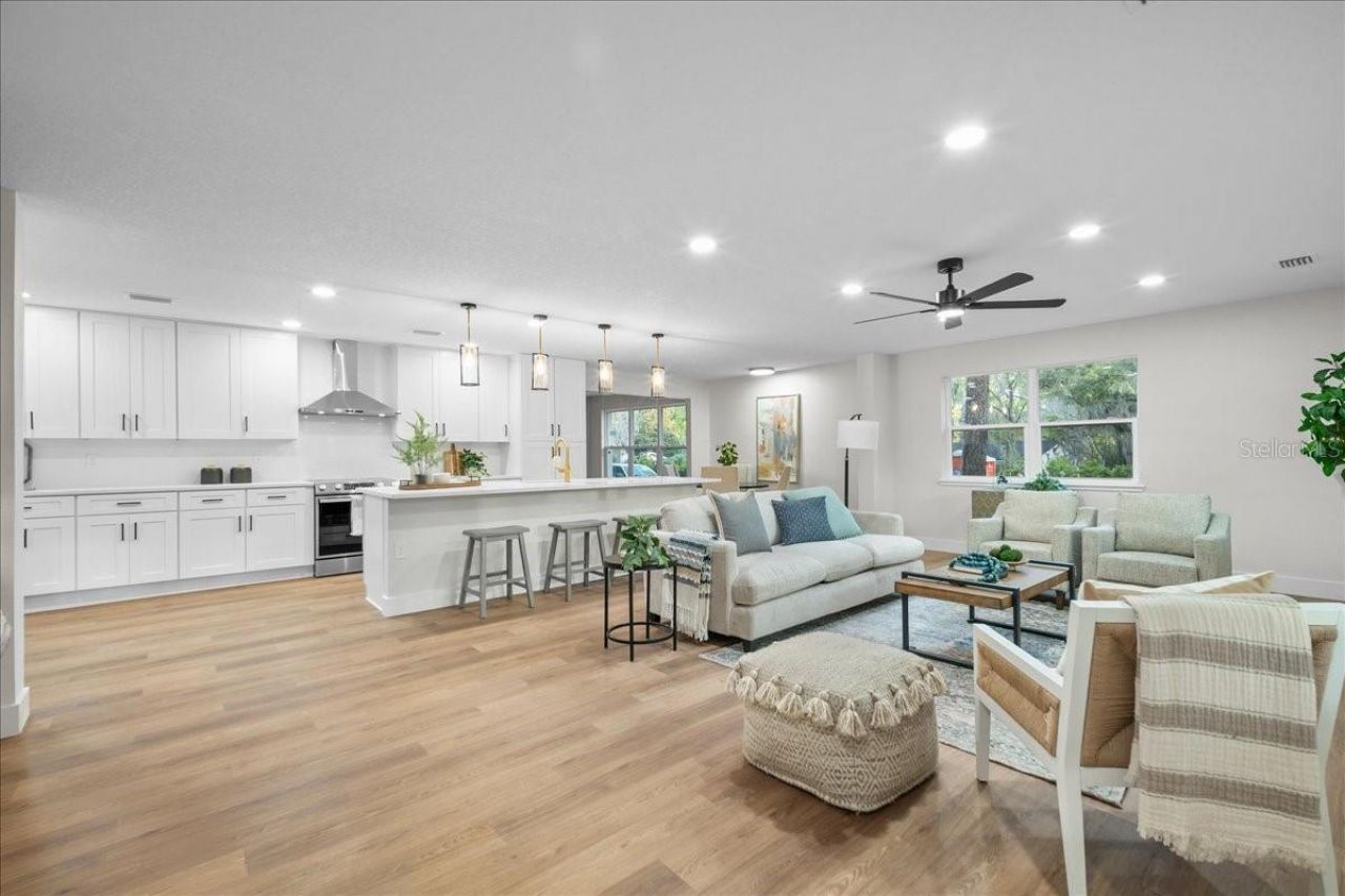 Mid Century charm, brand new......everything else! This attractive four bedroom three bathroom home has been completely renovated with new plumbing, electrical, HVAC, roof, windows, interior redesign, and so much more. The front door opens to a warm space for casual dining or enjoying company while preparing a meal in the expansive kitchen. Enjoy all new top of the line appliances and seemingly unending counterspace. Around the corner you will find a formal dining room highlighted with double width doors and fantastic natural light. One of these double doors leads to a sunken great room with brick fireplace. The perfect space for a quiet night in by the fire or hosting the whole team on game day. Across the great room you will find the spacious primary suite with attached bath featuring soaking tub and glass enclosed shower. Adjacent to the primary suite you will find another room with ensuite bath perfect for a nursery or home office. Passing through connects you to the hallway with two more large bedrooms and a full bathroom. This hallway returns you to the kitchen and family room. All this and a cavernous garage off the great room, large lot, and less than seven minutes to UF! Tour this home today!