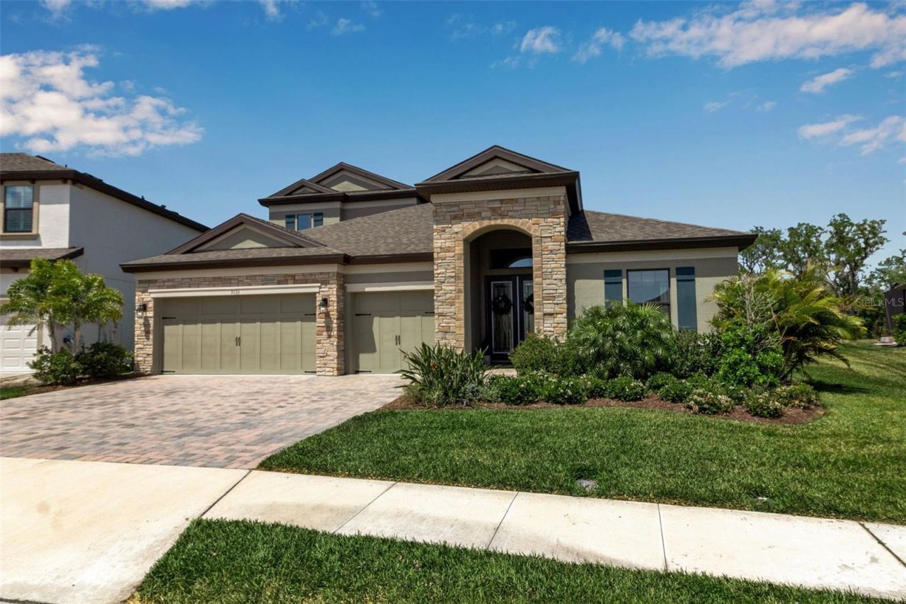 Prime waterfront lot surrounded by conservation in the highly sought-after North River Ranch community. This Homes by WestBay floorplan offers 4 bedrooms, 4 bathrooms, a 3-car garage, and 3,172 square feet of spacious, open-concept living. Enter through elegant double glass doors into an extra-wide foyer-just down the hall are a set of glass french doors that open to a sun-filled flex room, ideal for an office, den, or formal dining room. At the center of the home, the great room features a stunning 12-foot tray ceiling with custom wood beams and flows seamlessly into the deluxe kitchen and dining area. Expansive 24-foot glass sliders open to the extended covered lanai, creating the perfect indoor-outdoor living experience. Step outside to a custom-built pool with an oversized sunshelf, infinity-edge spa, and deep-end bench seating, all framed by Shellock pavers in a diamond pattern, turf accents, and a screened cage with a 50-foot clearview screen overlooking serene pond and conservation views. The first floor includes 3 bedrooms, thoughtfully placed in separate corners of the home for added privacy, along with 3 bathrooms. The private primary suite is located in the back corner and features abundant natural light, two walk-in closets, direct lanai access, and a luxurious en-suite bath with dual vanities, a makeup counter, garden tub, separate shower with glass door, bench, rainfall showerhead, secondary showerhead, private water closet, and large linen closet. Upstairs, you'll find an oversized bonus room, an additional bedroom, and a full bathroom. The first-floor laundry room leads to the 3-car garage, which has been upgraded with epoxy floors. Residents of North River Ranch enjoy access to exceptional amenities, including nature trails, a resort-style pool, a bike-share program, a dog park, a fitness center, a screened game room, pickleball courts, a bike park, and the new Camp Creek area with a café, social gathering space, workspaces, and a beach-entry pool with water slides. Come tour this beautiful move-in-ready home and experience the views, space, and lifestyle for yourself.